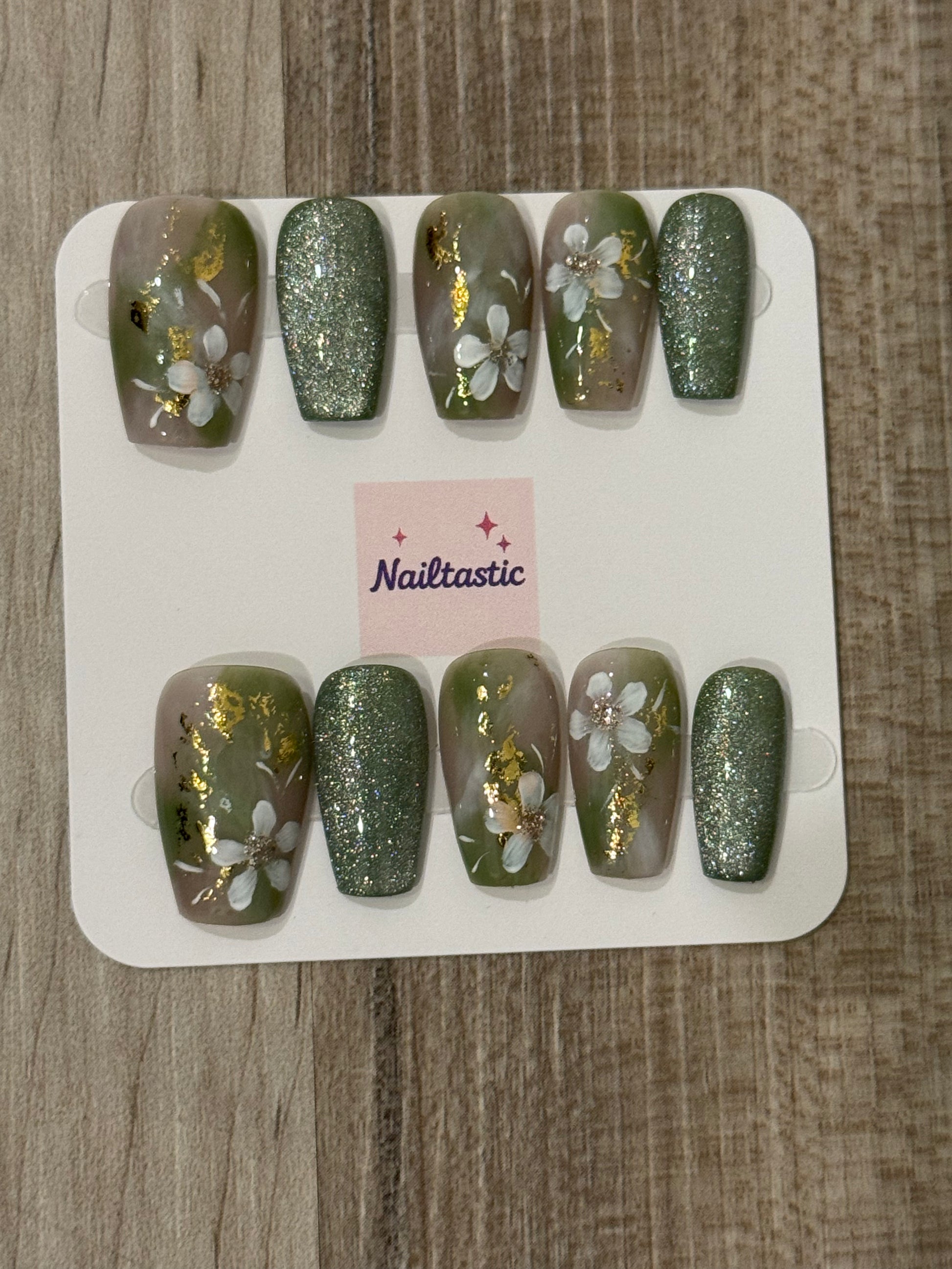 Handmade Press On Nails with Green Glitter and Floral Designs
